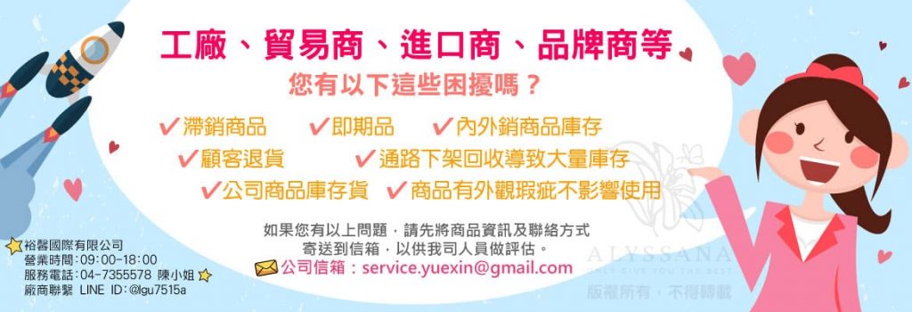 我們也擁有自有美妝保養品牌-ALYSSANA、食品品牌-吃貨,也積極拓展電商通路及實體通路,為業務擴展,極需多方各行各業一同協助開拓商機,互相提攜與學習,如果您擁有商品卻缺乏推廣管道,歡迎您與我們聯繫!