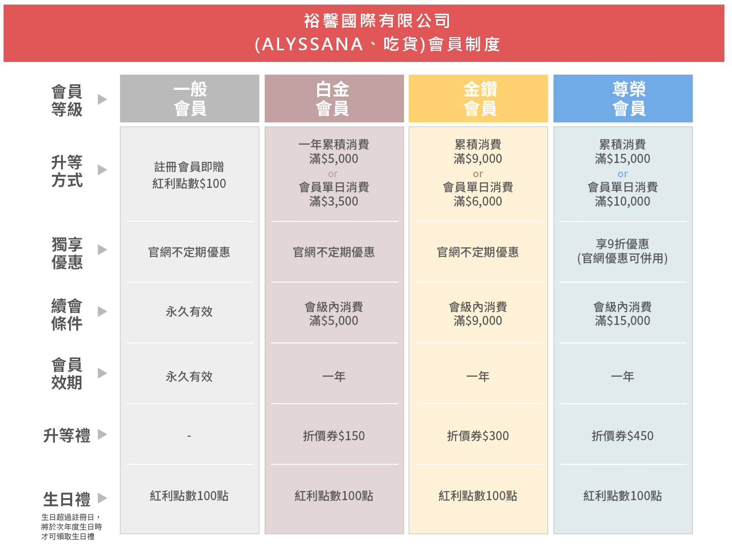 點數變現金,消費即可獲得紅利點數回饋紅利點數:消費100元=1點 / 1點可折抵1元 成為VIP ※首購優惠:加入會員就享有 100 點紅利點數,立即使用。※消費折抵:1點紅利點數可折抵1元消費金額,訂單不限金額皆可使用。※消費紅利:每消費 100 元 贈送 1 點紅利,累積折抵。 邀請好友加入 【會員帳戶使用規範】1. 為保障所有會員的權益,會員每人只限擁有乙個會員帳戶。2. 若發現有重複註冊或同一人持有多個會員帳戶的情形,官網有權不經事先通知,立即暫停或終止其會員資格。該帳戶中所有累積點數與未使用之優惠券將一併失效,恕不補發。3. 每位手機號碼只可申請一位個人會員資格。 【官網會員點數兌換說明】1. 登入官網會員網站即可修改個人資料、查詢會員現有點數和點數折抵記錄。2. 無登入官網註冊成為會員的消費,將無法獲得消費累計點數以及點數折抵之服務。3. 每筆消費所得之會員點數,將於安心網路7天鑑賞期後,才會進行發送。因系統作業時間不一,遲延3-5個工作天點數發送完成為正常現象4. 會員登入後可至〔我的帳戶〕查看目前所屬的會員等級優惠與帳戶購物金資訊 【如何累積紅利點數】依據官網單次購物折扣後金額,每100元贈送1點紅利回饋,於7日鑑賞期後訂單完成10天內匯入會員帳號。 【如何使用紅利點數】每單一商品都有可折抵之紅利點數金額,結帳時於購物車內勾選使用折抵。 【紅利點數使用限制與規範】1. 紅利點數僅限兌換商品,不得折換現金。2. 紅利點數以一人一帳號為限,限會員本人兌換,點數不得合併或轉讓。3. 因故辦理退貨退款者,原先已取得之紅利點數將於退貨手續完成後,依退款金額折算紅利點數予以扣除。4. 每次所消費累積的點數將於該筆消費日的360天後到期。本公司有權隨時變更、修改或終止紅利點數規則及約定條款,並得於修訂後公佈在本官網並另行個別通知,您可隨時在本官網上詳閱修訂後的相關事項。 AYSSANA 吃 貨