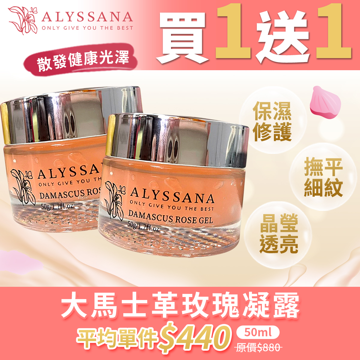 - 黃金藻保護因子、玫瑰精油;長期使用可改善細紋、修護肌膚,達到彈潤透亮的效果。