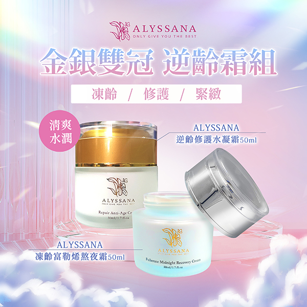 【金銀雙冠 】ALYSSANA逆齡霜組(逆齡修護水凝霜+凍齡富勒烯熬夜霜 各1入)