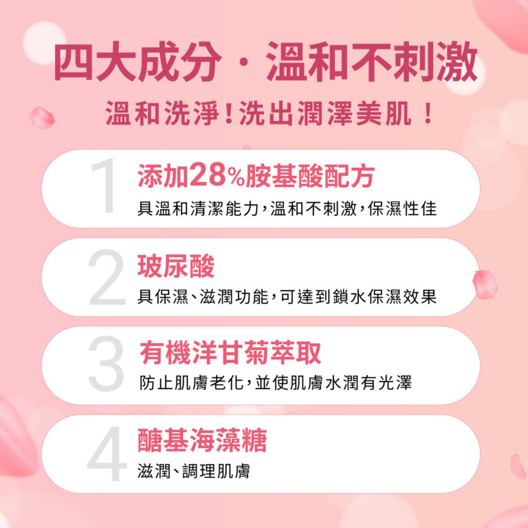 - 添加玻尿酸保濕成份,洗完不緊繃、不乾澀,使肌膚更水嫩。