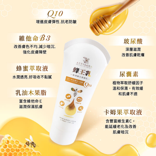 - 組合內容 ALYSSANA 蜂王乳Q10保濕嫩白護手霜100ml x 4件 ALYSSANA蜂王乳凝露50ml x 2件