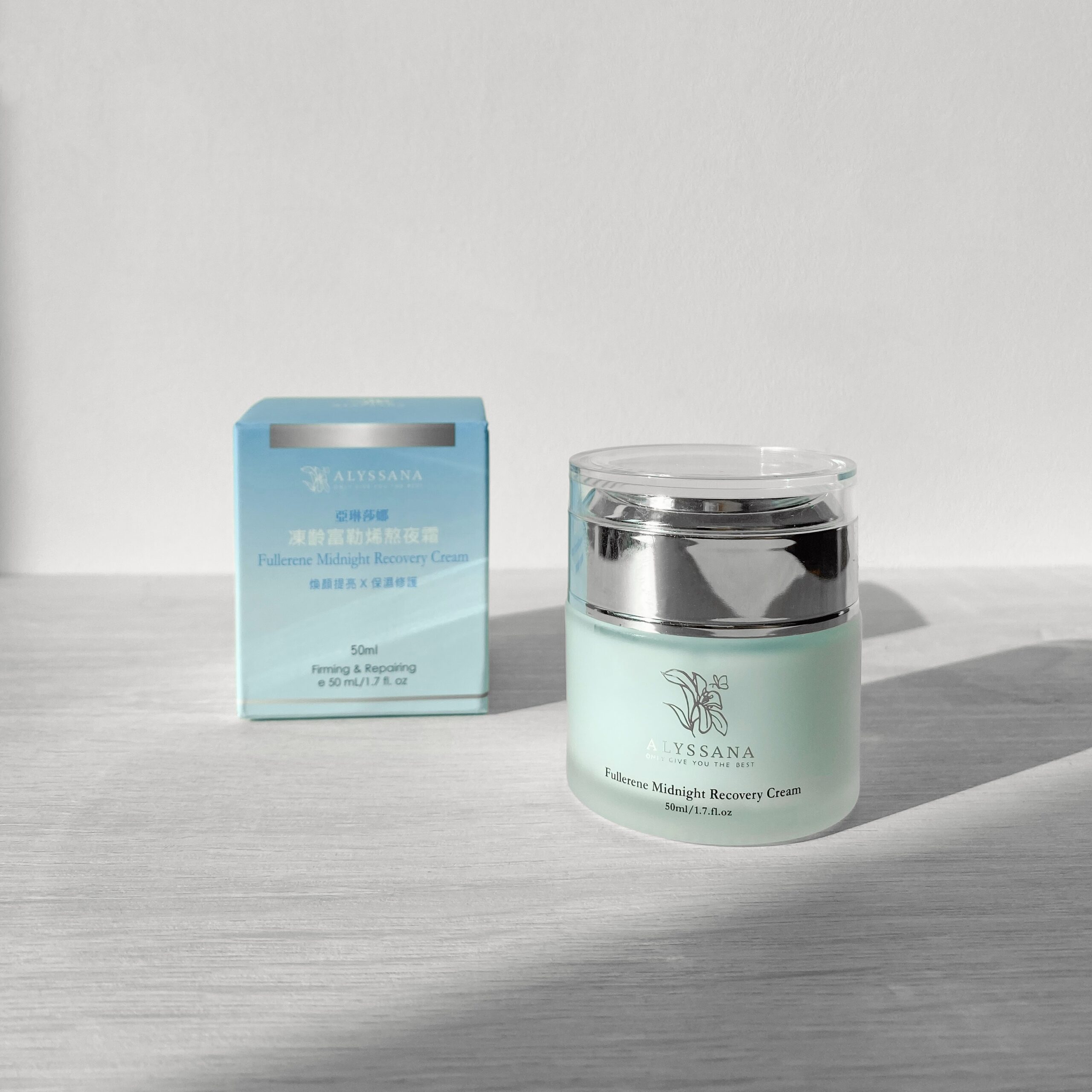 「ALYSSANA 凍齡富勒烯熬夜霜」是專為繁忙的現代女性設計的夜間修護霜,添加【諾貝爾級的保養成份-富勒烯】,這個被譽為「美容界的鑽石」的成分,輕盈卻富含修護力的質地,不會帶來厚重感,卻能讓肌膚在一夜之間補足水分,早晨醒來時光澤感滿分,告別倦容與蠟黃肌,因此有「夜間魔法霜」的稱號!